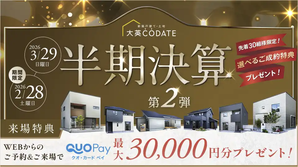 ※クオ・カードペイ最大3万円分の内訳は、ご来場予定日の前日までにHPからご予約いただき、事前アンケートへのご回答で1万円分、ご来場および物件見学後アンケートへのご回答で+1万円分、住宅ローンの事前審査のご提出で+1万円分となります。※真剣に住宅購入をご検討中の20歳以上の方で、「初めて」ご来場される方に限ります。※アンケートへのご回答・1件以上の物件見学が必須となります。また、住宅購入のご検討状況やご要望の具体性をスタッフより伺います。※複数店舗にご来場された場合でも「プレゼントは1家族様1回限り」です。※ご本人様確認の為、各種証明書をご提示いただける方に限ります。※外国籍の方は、在留カード(永住資格を確認できる書類)のご提示をいただける方、もしくはご来場者のうちどなたかが永住権をお持ちの方に限ります。予めご了承ください。※ご予約状況によっては、ご予約の時間帯を調整いただく場合がございます。※その他のポータルサイト(建売ナビを含む)やチラシ等の予約特典との併用はできません。※第三者の為のご見学をご希望の方は対象外となります。(お子様や知人のマイホーム検討のお手伝い等)※クオペイのお渡しは後日の送付となります。【2026年3月29日までの来場が対象です】