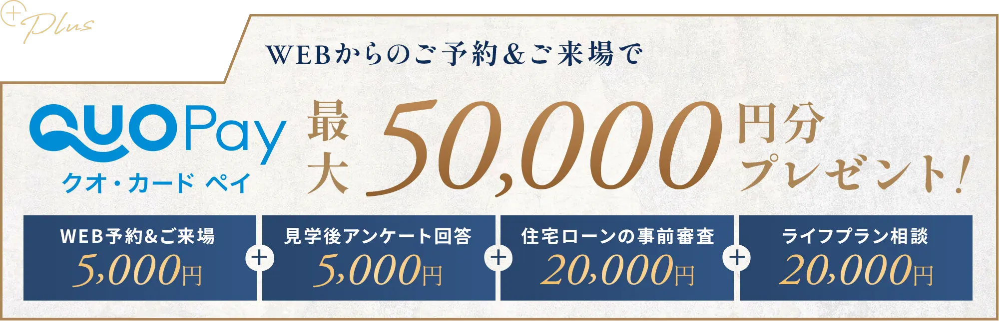 ※前日までにHPよりご予約いただきご来場された方が対象です。※クオペイ5万円分の内訳は、WEB予約の上ご来場で5千円、物件見学後アンケートへのご回答で+5千円、住宅ローンの事前審査のご提出で+2万円、弊社ライフプランナーによるライフプラン相談へのご参加で+2万円となります。 ※真剣に住宅購入をご検討中の20歳以上の方で、「初めて」ご来場される方に限ります。※「アンケートへのご回答・1件以上の物件見学」が必要となります。また、住宅購入のご検討状況やご希望の条件などをスタッフよりお伺いいたします。※複数店舗にご来場された場合でも「プレゼントは1家族様1回限り」です。 ※ご本人様確認の為、身分証明書をご提示いただける方に限ります。 ※外国籍の方は、在留カード(永住資格を確認できる書類)のご提示をいただける方、もしくは、ご来場者の内どなたかが永住権をお持ちの方に限ります。予めご了承ください。※ご予約状況によっては、ご予約の時間帯を調整いただく場合がございます。※その他のポータルサイト(建売ナビを含む)やチラシ等の予約特典との併用はできません。※第三者の方の為のご見学をご希望の方は対象外となります(お子様や知人さまのマイホーム検討のお手伝い等)※クオペイのお渡しは後日の送付となります。