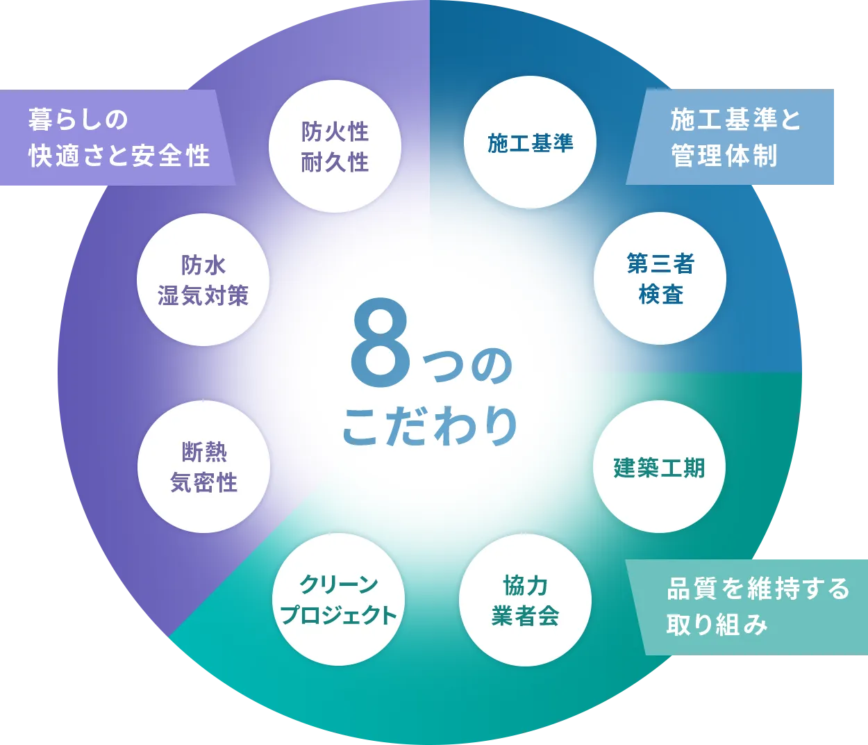 大英CODATEでは、全現場に専属の設計担当・監督を配置。8つのこだわりを掲げ、指針のない建築工程・造成工事にも独自の基準を設けて検査・施工を行っています。