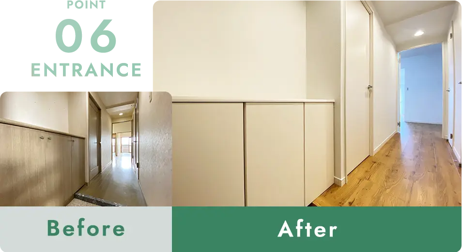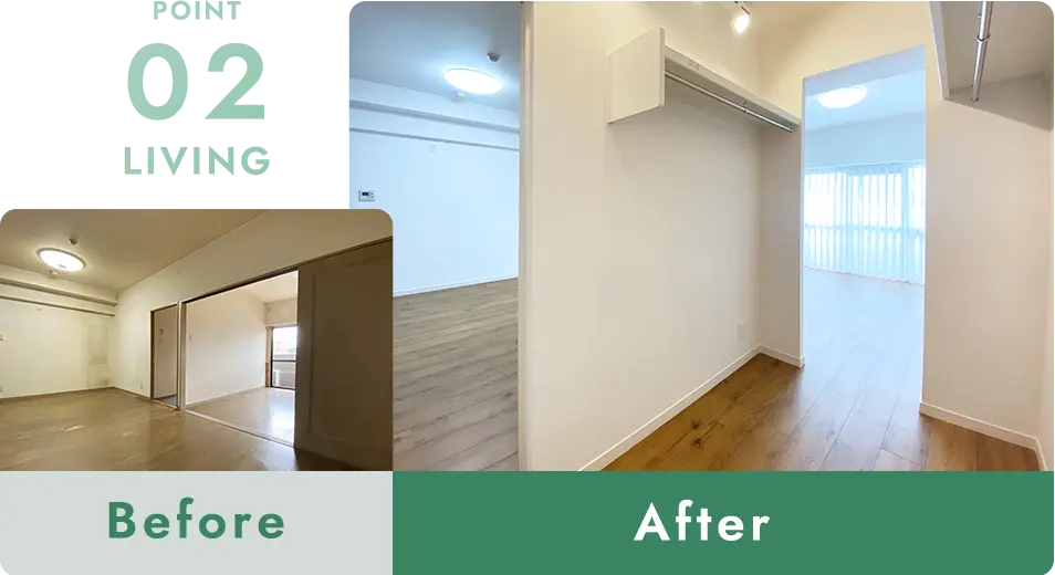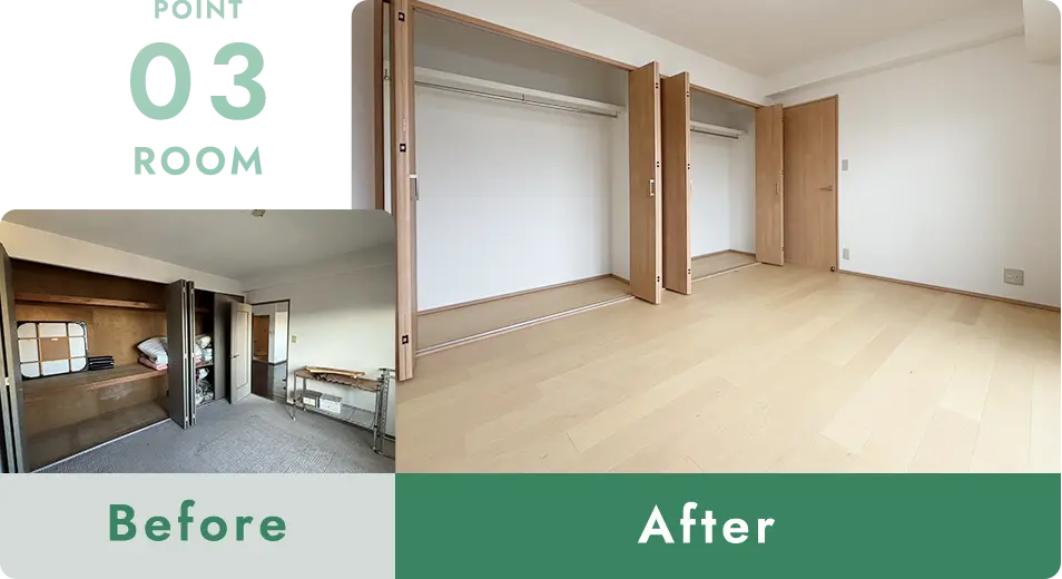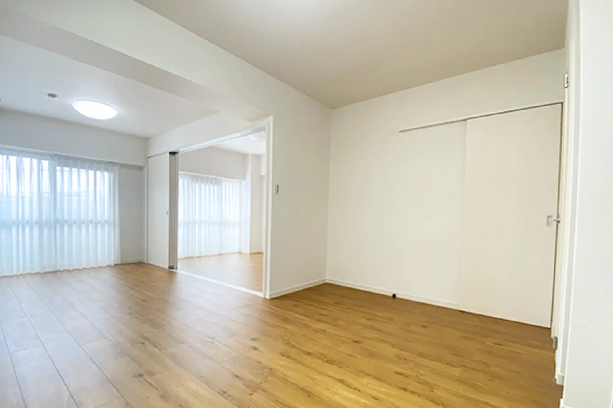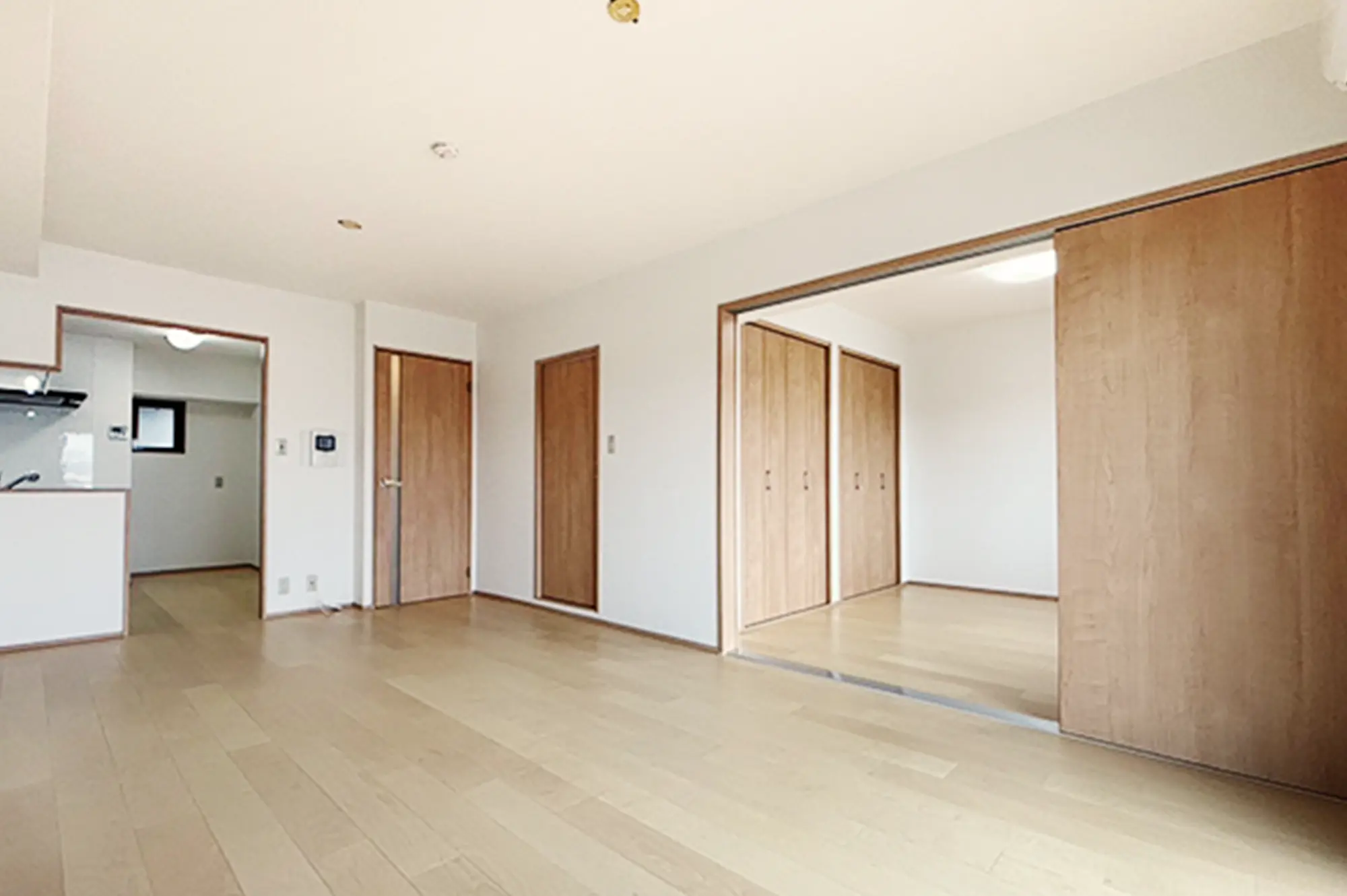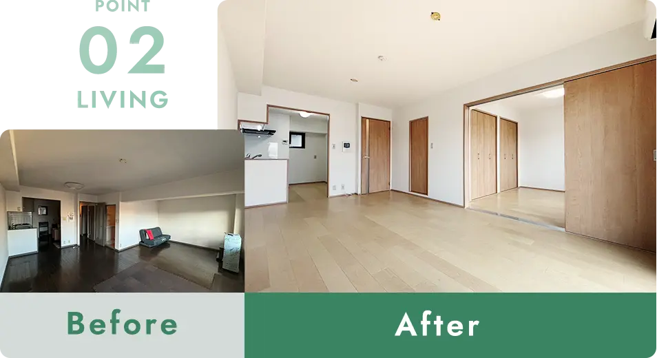 2LDKから3LDKへ間取りを変更。建具やフローリングはナチュラルな木目で統一し、自然な温もりを感じられる落ち着いた住まいに仕上がりました。